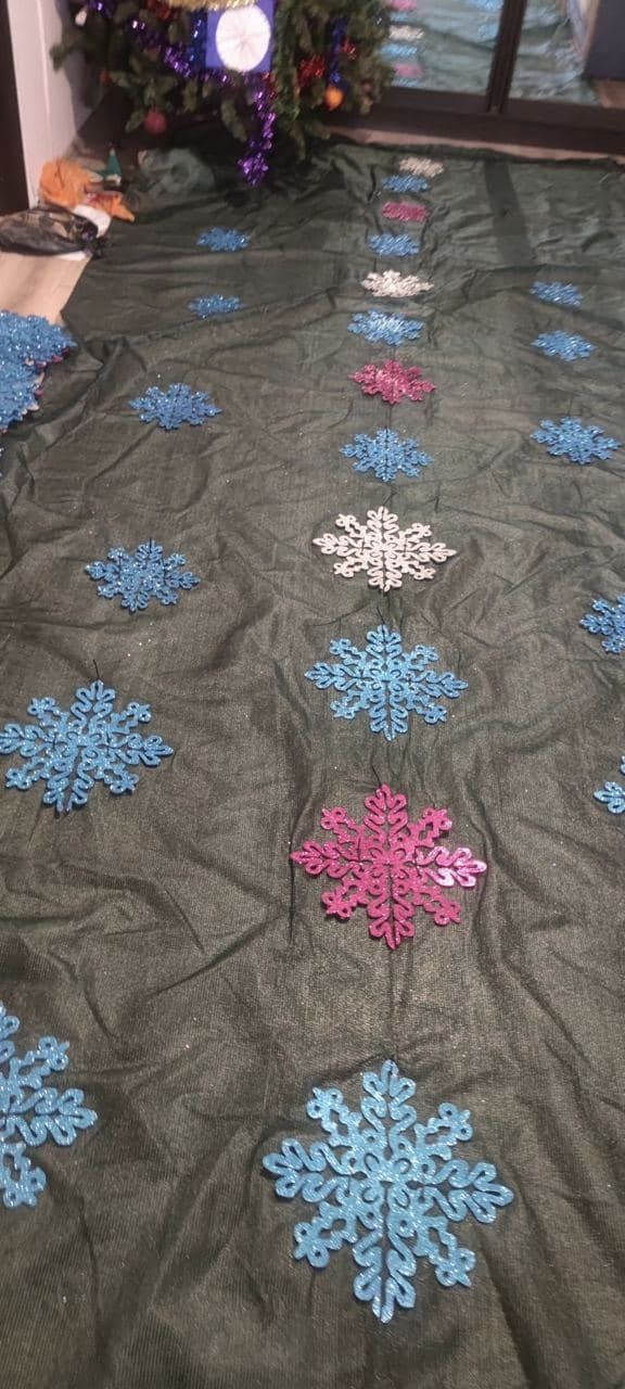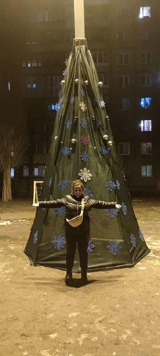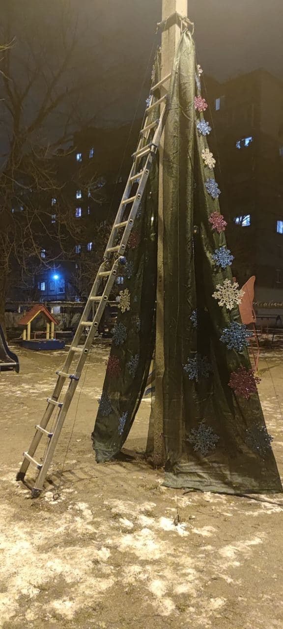Находчивые днепряне установили на фонарный столб специальное металлическое крепление, на которое подвесили ткань. Закрепили это все так, чтобы конструкция визуально напоминала елку. Украсили ее крупными снежинками белого, красного и синего цвета.