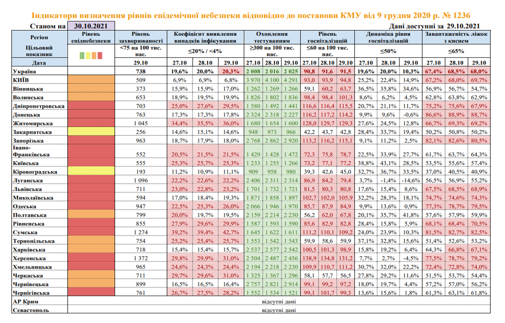 В субботу, 30 октября, в Украине обновили карантинные зоны. На данный момент ни одна область не находится в «зеленой» зоне. 15 регионов теперь в «красной», 7 и столица - в «оранжевой».