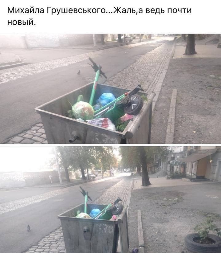 Если самокат не получается сломать, его можно просто выкинуть. Так, по всей видимости, посчитали вандалы с улицы Михаила Грушевского, где позже местные жители обнаружили в мусорном баке шеринговый электросамокат без видимых повреждений.