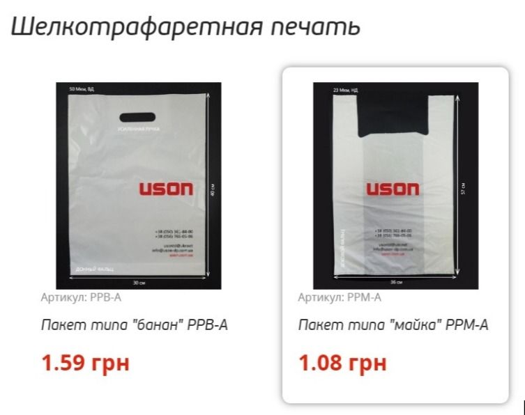 Полиэтиленовые пакеты – это также предметы, которыми пользуются каждый день. Люди видят название бренда в транспорте, общественных местах и на улице. Поэтому и лого запоминается. Торговый дом USON предлагает оперативные услуги и печать на двух типах этого изделия: