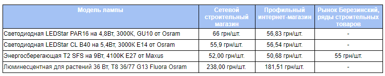 Как видим, цены на стандартные лампочки в интернете и строительном супермаркете практически идентичны. А вот специальная лампа для роста растений намного дешевле в онлайн-магазине. На рынке эксперимент практически потерпел крушение, так как из запрашиваемых моделей обнаружилась только одна позиция. И та дороже, чем у маститых конкурентов.