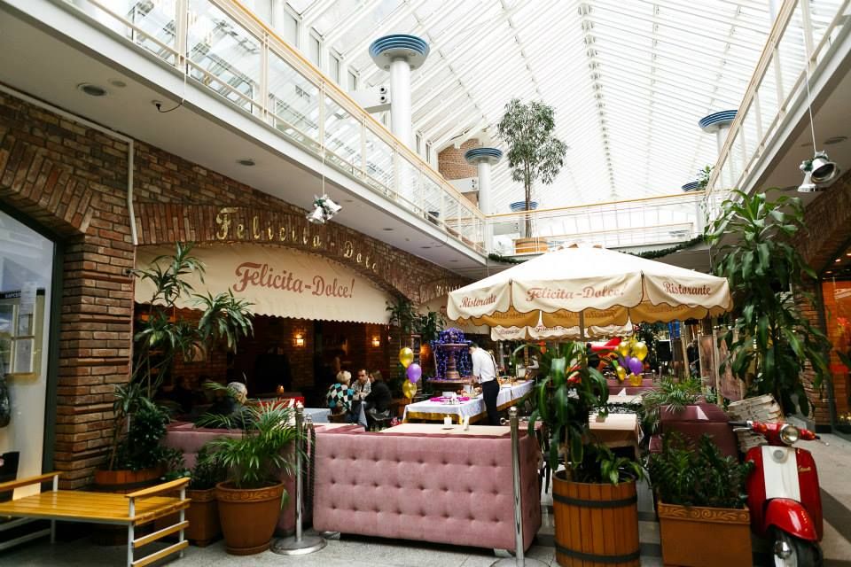 Вкусно и приятно провести время в центре города можно в ресторане «Felicita-Dolce!», который расположен в ТЦ Гранд-Плаза. Основатели заведения утверждают, что все блюда приготовлены без заготовок и исключительно из экологически чистых продуктов. Кошерное меню ресторана представлено салатами, супами, яствами из морепродуктов, рыбы, мяса, пастой и пиццей. Ценители десертов смогут вдоволь насладиться сладостями собственного приготовления, к числу которых относят торты, конфеты, мороженое, пирожные и даже печенье. Интерьер заведения вполне соответствует итальянским улочкам, где можно присесть на мягкий диванчик и попробовать охлаждающий лимончелло в жаркий день. Территория декорирована стильными вазонами с лиственными цветами, карликовым деревьями, что добавляет свежести и натуральности залу. Выносная мебель представлена мягкими диванами в пастельно-розовых тонах, при этом гармонично сочетающихся с крупными зонтиками, которые добавляют заведению итальянского шарма. Территория ресторана открытого типа ничем не ограждена, однако гости не пропустят заведение, поскольку зал занимает практически всю площадь на первом этаже Гранд Плазы.