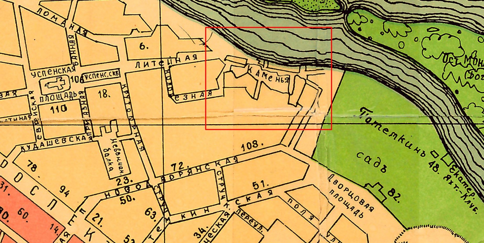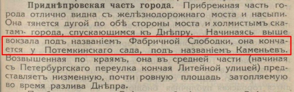 «Начиная с Литейной улицы, вплоть до Потемкинского сада, прибрежная часть города круто поворачивает кверху. Проложенные здесь улочки представляют ряд крутых подъемов под названием Мусманской горы (мимо губернской земской управы), Новой улицы и, наконец, Каменьев. Каменья - это возвышенная часть города, расположена на берегу Днепра и ведущая к Потемкинскому саду. Дома здесь распланированы неправильно и стоят на отдельных террасах. Все улица изрезана рядом улочек, ведущих к берегу и ограде Потемкинского сада. Берег носит на себе все следы горной породы. В этом месте Днепр прорывает Карпатскую гряду. Вот почему, начиная отсюда, берег скалистый и усеян мелкими и острыми камнями. От Каменьев вверх идет ряд живописных, расположенных на швейцарский лад, улиц...», - из книги «Днепропетровску 200 лет», сборник документов и материалов, 1976 года.