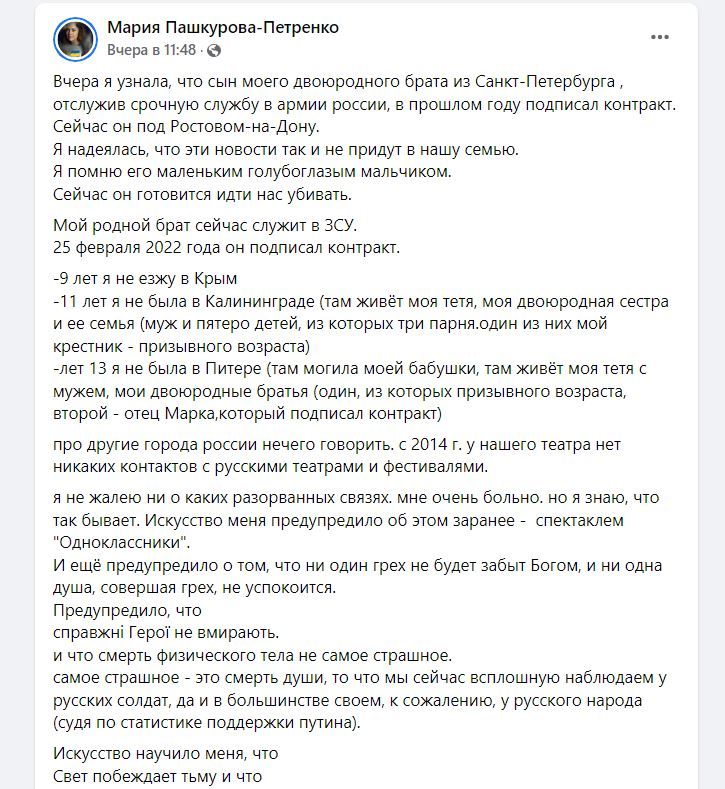Мария Пашкурова-Петренко, актриса днепровского театра "Верим" поделилась собственной историей о том, как ее дальние родственники подписывают контракты с российской армией в рф и могут прийти ее убивать. Также она рассказала о других родственниках из россии, с которыми после 2014 года пришлось оборвать контакты. Об этом она не жалеет, но все равно чувствует боль.