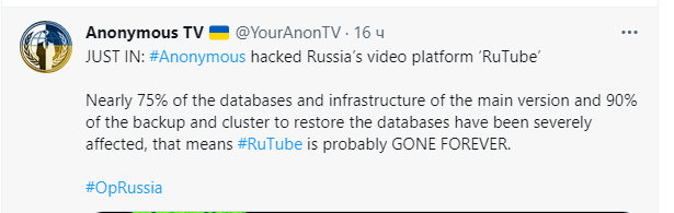 "Anonymous взломали российскую видеоплатформу RuTube. Почти 75% баз данных и инфраструктуры основной версии и 90% резервной копии и кластера для восстановления баз данных серьезно пострадали, что означает, что RuTube, вероятно, исчез навсегда", – сообщают Anonymous в Twitter.