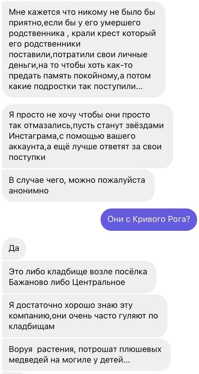 Криворожане отмечают, что не раз видели эту компанию на кладбищах. Они воруют цветы и портят вещи, которые оставляют родственники погибших. Теперь они вырвали крест с могилы. В качестве доказательств они приводят посты со страницы одной из девушек. Там в сторис, есть видео, где заметно, что парень держит могильный крест.