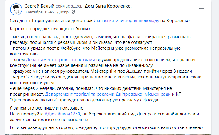 Не игнорируйте #Дизайнкод1250, он бережет внешний вид Днепра и его любят жители и жалуются на тех кто его не выполняет. Если вы равнодушны к городу, ожидайте, что город будет относиться к вам соответственно, - отметил он.