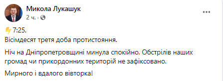 "Восемьдесят третьи сутки противостояния. Ночь в Днепропетровской области прошла спокойно. Обстрелы наших громад или приграничных территорий не зафиксированы. Мирного и удачного вторника!" - написал он.