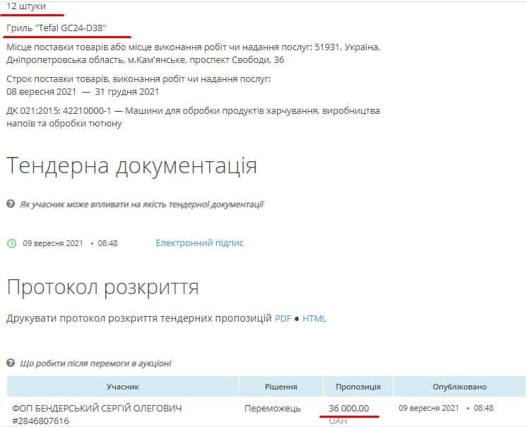 Техника, которая была закуплена у ФЛП Бендерский Сергей Олегович, обошлась в 36 тысяч гривен. А это значит, что один гриль стоит 3000 гривен.