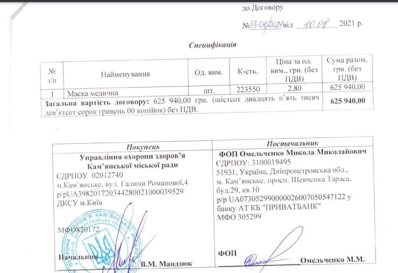 В управлении здравоохранения Каменского городского совета не считают нужным экономить на одноразовых медицинских масках. Недавно управление закупило у ФЛП Омельченко Николай Николаевич маски на сумму 625 940 гривен. Эти деньги заплатили за 223 550 маски. Соответственно, стоимость одной маски составляет 2,8 гривен.