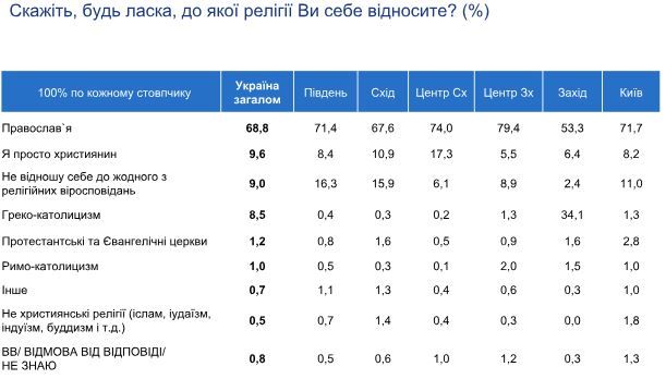 Как показали результаты опроса, две трети украинцев называют себя православными - 68,8%. Еще 9,6% назвали себя просто христианами, без определения течения, 8,5% - греко-католиками, а 9% не относят себя ни к одному религиозному вероисповеданию.