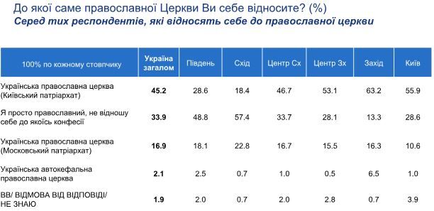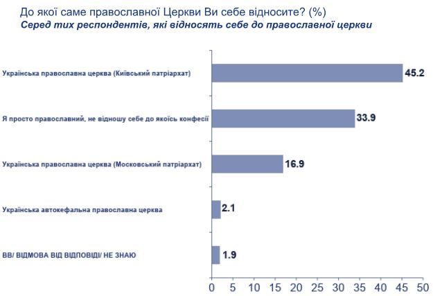 Еще почти 34% просто считают себя православными, не относя себя к какой-либо конфессии, а 2% православных выбрали для себя Украинскую автокефальную православную церковь.