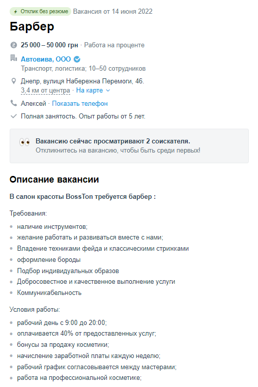 От 25 до 50 тыс грн в Днепре может заработать барбер. Среди требований: наличие инструментов, владение техниками фейда и уметь делать классические стрижки и оформлять бороду. От соискателя нужно добросовестное и качественное выполнение услуг, коммуникабельность и умение подбирать индивидуальный образ. Работодатель обещает начислять зарплату каждую неделю, бонусы за продажу косметики «плавающий» рабочий график и 40% оплаты от предоставленных услуг.