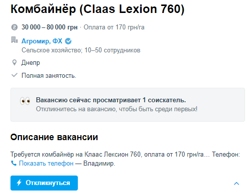 Комбайнер в Днепре может заработать от 30 до 80 тыс грн, в зависимости от того, как быстро будет управляться на поле с машиной. Один гектар оплачивается в размере 170 грн. Все детали обещают рассказать по телефону. Водить нужно будет комбайн Claas Lexion 760.