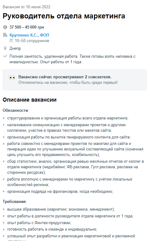 Руководитель отдела маркетинга может получать от 37,5 до 45 тыс грн в месяц. В его обязанности будет входить структурирование и организация работы всего отдела, налаживание коммуникации с менеджерами проектов и другими коллегами, организация работы по вычитке генерируемого контента для сайта, сбор статистики, анализ того, как работает та или иная реклама и прочее. Среди требований – необходимость иметь высшее профильное образование, опыт работы в должности руководителя от года, наличие успешного опыта в построении и продвижении бренда, реализации маркетинговой и рекламной стратегии, владение разговорным английским. Обещают возможность удаленной работы и официальное трудоустройство.