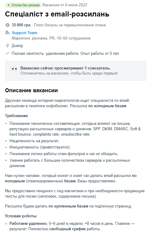 35 тыс грн может заработать специалист по email-рассылкам. Чтобы получить эту должность соискатель должен иметь опыт работы от 5 лет. Нужно понимать логику работы спам-фильтров и уметь их обходить, уметь работать с большим количество серверов и рассылочных доменов, быть нацеленным на результат и инициативным. А вот работать придется не 5, а 6 часов в неделю. Среди обязанностей рассылка 200-300 тыс писем в день увеличение целевого трафика на 3-5 тыс.