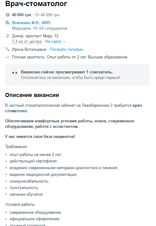 От 40 тыс грн может получать врач-стоматолог, работая в частном кабинете. Нужно иметь опыт работы не менее 2-х лет, действующий сертификат врача, помимо лечения зубов вести медицинскую документацию, быть пунктуальным, коммуникабельным и иметь желание учиться новому. От себя работодатель обещает современное оборудование и дружный коллектив.