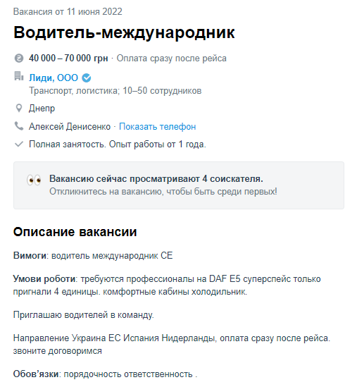 От 40 до 70 тыс грн в месяц может заработать водитель-международник, имеющий категорию прав СЕ. Ездить нужно будет по маршруту Украина-Испания-Нидерланды, оплату обещают сразу, после каждого рейса. Водить нужно будет фуру-холодильник. Из требований – опыт работы до 1 года и порядочность.
