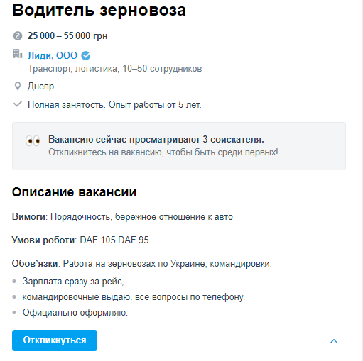 Чуть больше – от 25 до 55 тыс грн в месяц может заработать водитель зерновоза в Днепре. Нужно иметь опыт работы от 5 лет, права, позволяющие водить машину DAF 105 и знать, как доехать из одного города Украины в другой. Обещают официальное оформление, командировочные и оплату за каждый рейс.