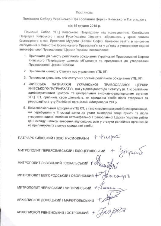 «Поскольку данного собора не было, Украинская Православная Церковь Киевского Патриархата продолжает существовать и далее, тем более, что она зарегистрирована во всех государственных органах. Проведение собора 15 декабря 2018 года сопровождалось рядом нарушений, следовательно, это нельзя назвать поместным собором», - отмечают представители УПЦ КП.