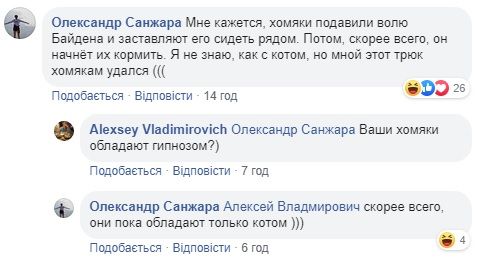 У кота Байдена, живущего в днепровской мэрии в кабинете заместителя градоначальника, появилось новое увлечение. В последнее время он часами сидит рядом с клеткой с хомяками, которые обитают у другого высокопоставленного городского чиновника – секретаря горсовета Александра Санжары. В связи с этим, Лысенко в шутливой форме выразил серьезную озабоченность безопасностью последних.