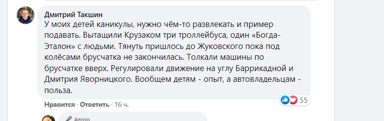 Дмитрий Такшин рассказал, что занимался добрый делом, потому что у детей каникулы их надо развлекать. А в этот раз удалось совместить приятное с полезным. Всего за вечер ему удалось вытащить три троллейбуса, один автобус с людьми. Его он тащил аж до улицы Жуковского, пока не закончилась брусчатка. Он практически регулировал движение на углу улицы Баррикадной и проспекта Дмитрия Яворницкого.
