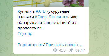 Упаковку неглазурованных кукурузных палочек купили в днепровском АТБ. А вот внутри вместе со сладким снеком лежала металлическая проволока. Деталь по размеру меньше самих палочек, поэтому ее вполне можно было проглотить по неосторожности. К счастью, покупатели вовремя заметили подвох.