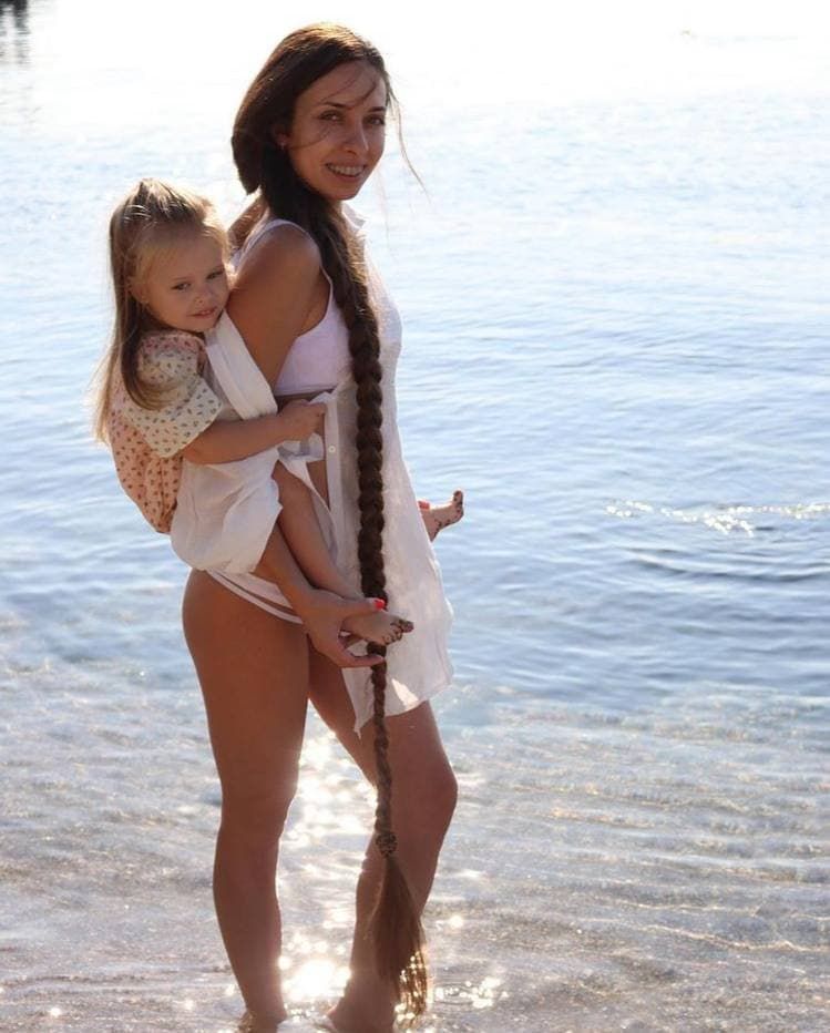 "Мне просто захотелось длинные волосы. Сначала думала, что они будут по пояс, потом ниже попы, потом до колен и потом много лет я держала длину до пят. Во время беременности волосы отрасли намного больше - я уже не захотела их отрезать. Длину ближайшее время убирать точно не собираюсь. Я кайфую от своих волос!", - рассказывает Алена.