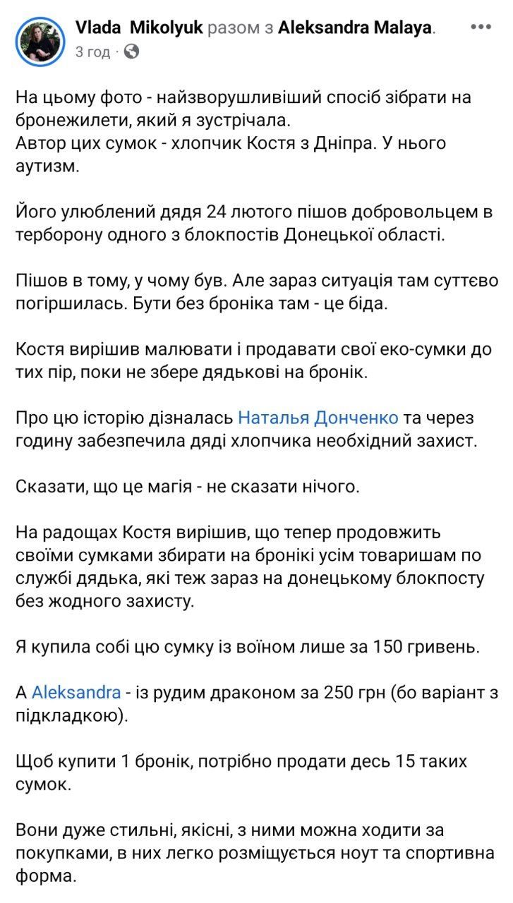 Деньги с продажи сумок пойдут на закупку бронежилетов.