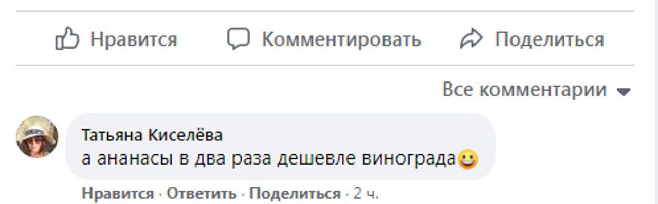 Другие пользователи тоже не удержались от комментариев. Татьяна Киселёва пишет, что ананасы в два раза дешевле винограда!