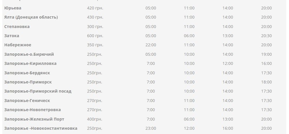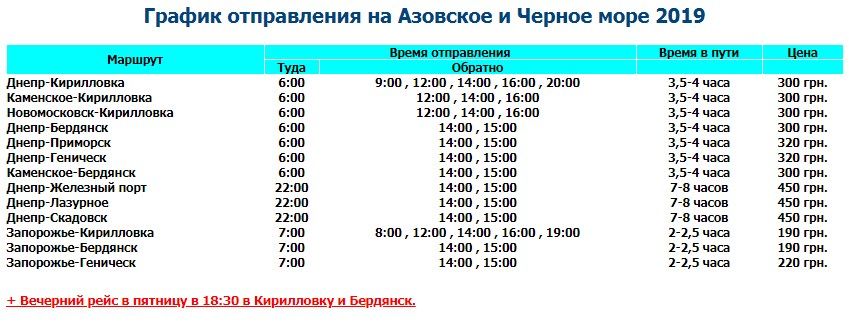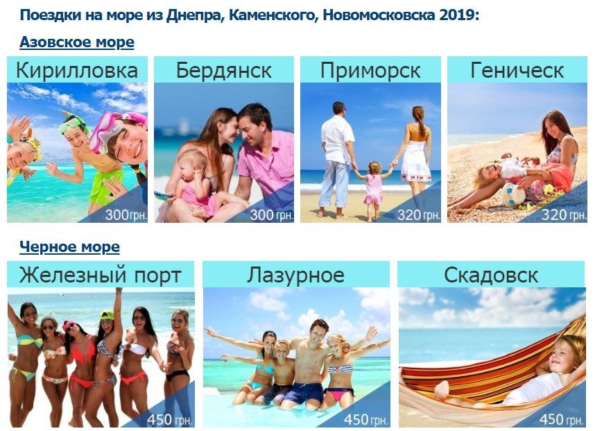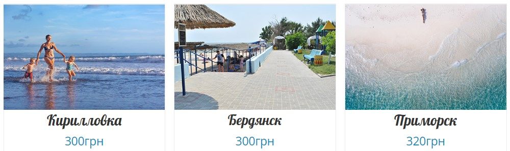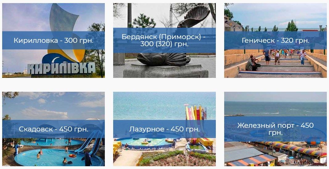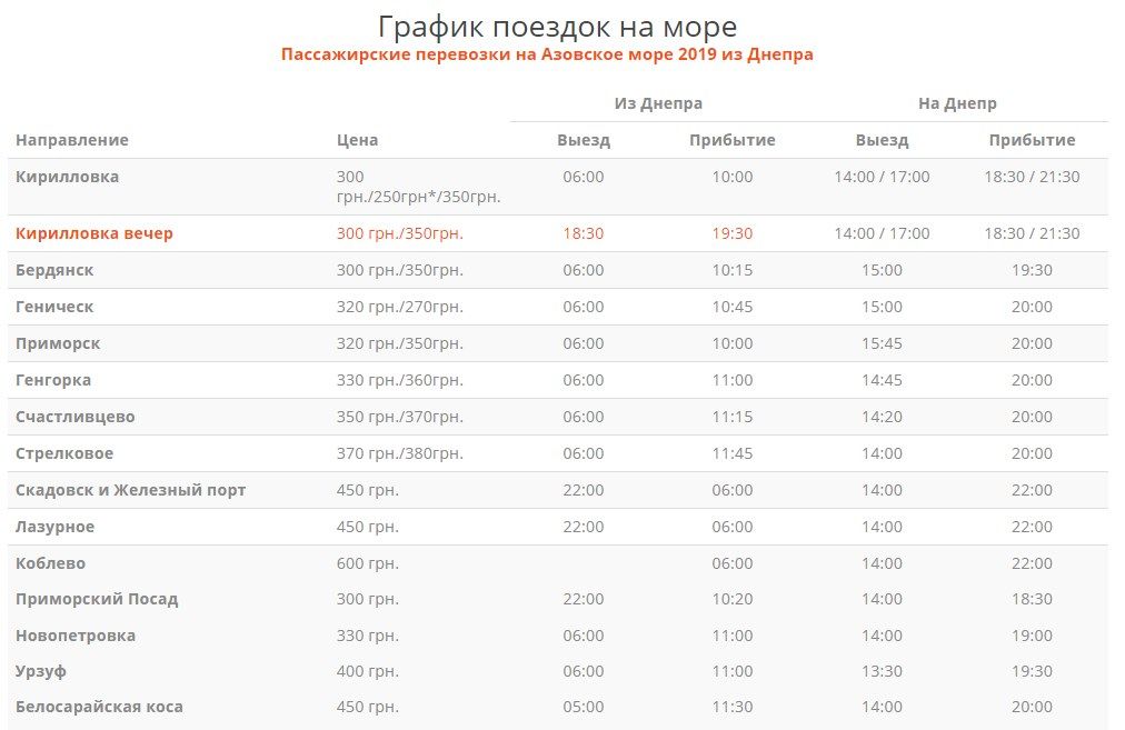 С Днепра в Лазурное поездка обойдется от 290 грн., а Кирилловку – от 230 грн., в Бердянск – от 200 грн., в Коблево – от 490 грн., в Одессу – от 350 грн.