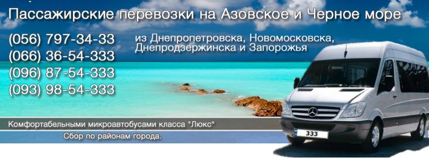 Транспортная компания осуществляет пассажирские перевозки на море с Днепра, Приднепровска, Подгороднего, Игрени и Каменского. Пассажиров в кратчайшие сроки доставят на Азовское или Черное море в комфортабельном микроавтобусе. Производятся поездки в Кирилловку (на Пересыпь и Федотову косу до Степка), в Бердянск и на косы, Приморск, Геническ и на Арабатскую стрелку (Генгорку, Счастливцево и Стрелковое), в Скадовск, Лазурное и Железный Порт.