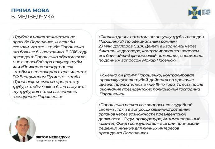 Кум Путина нардеп Виктор Медведчук, которому выдвинуто подозрение в государственной измене и содействии терроризму, рассказал о схеме вывода из государственной собственности части магистрального нефтепродуктопровода "Самара – Западное направление" для дальнейшей прокачки через него дизельного топлива.