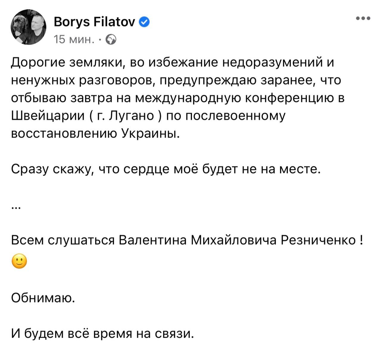 Дорогие земляки, во избежание недоразумений и ненужных разговоров, предупреждаю заранее, что отбываю завтра на международную конференцию в Швейцарии ( г. Лугано ) по послевоенному восстановлению Украины.