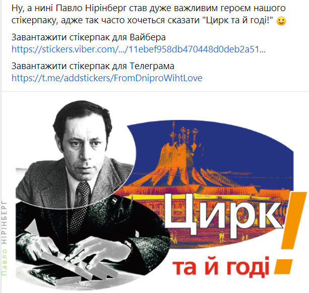 На страничке музея в соцсетях работники рассказали об одном из героев стикерпака - архитекторе Павле Ниринберге. Он создал здание горсовета, кинолекторий в парке Шевченко, "Дом Книги".  Однако самым известным его проектом остается здание Цирка на Сичеславской Набережной.