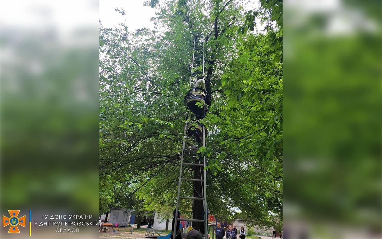Днём к спасателям обратилась женщина и рассказала, что ее питомец залез на дерево и не может самостоятельно оттуда слезть. Это случилось на улице Севкеродонецкой Самарского района Днепра.