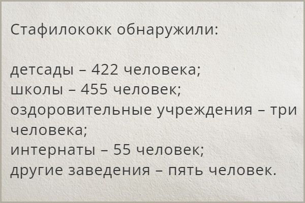 Такие проверки состоялись в 3 002 заведениях, а в целом обследовали уже 9117 человек. В ходе внезапных проверок у 940 работников пищеблоков обнаружили стафилококк (это 10% от общего количества проверенных).