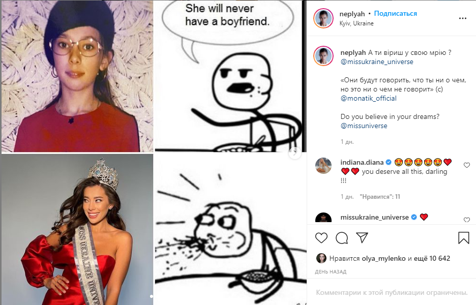 Мисс Украина активно ведет свои соцсети и теперь поделилась со своими подписчиками детскими фотографиями. Одну из них она вставила в мем.