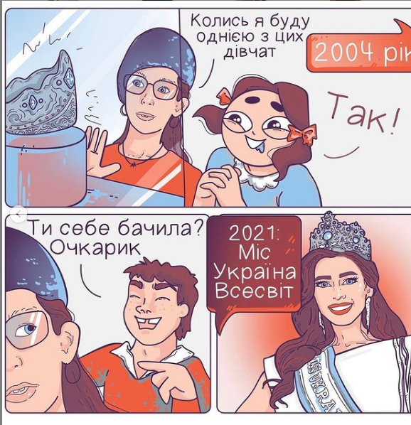 Она также отметила, что сбылась ее детская мечта. На фан-арте изображена ситуация из детства, когда мальчик-одноклассник высмеивает ее желание получить корону победительницы в конкурсе красоты. Но в 2021 она смогла исполнить свою мечту.