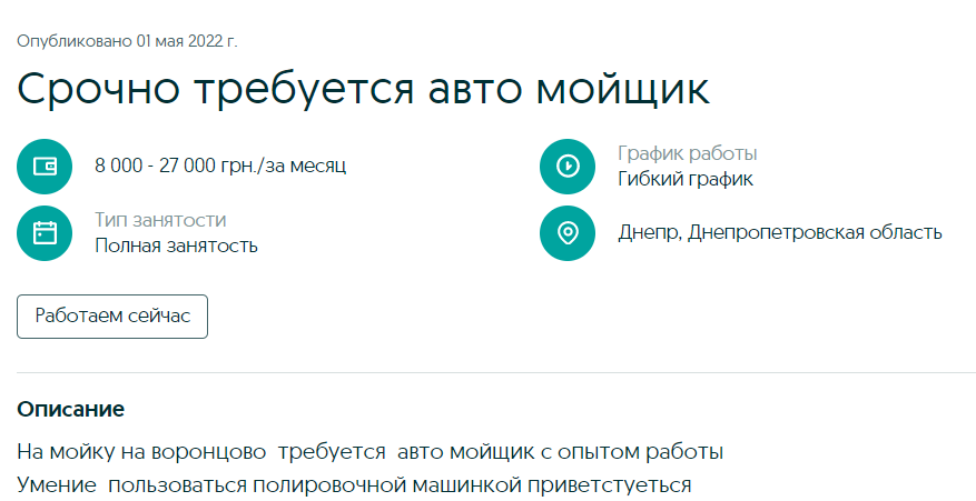На автомойку в Днепре требуется мойщик. Опыт работы очень желателен. Обещают гибкий график работы, полную занятость и зарплату от 8 до 27 тыс грн.