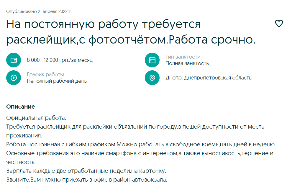 От 8 до 12 тыс грн в месяц будет получать расклейщик объявлений. Работа срочная. Обещают довольно необычный график. С одной стороны, обещают полную занятость, а с другой – неполный рабочий день. Работа официальная, постоянная. Занятость 5 дней  в неделю. Работодатель обещает, что клеить объявления нужно будет в пешей доступности от места проживания работника. Зарплата выдается каждые две недели. Среди требований: наличие смартфона с интернетом, а также выносливость, терпение и честность. По итогу сделанной работы нужно будет отправлять фотоотчет.