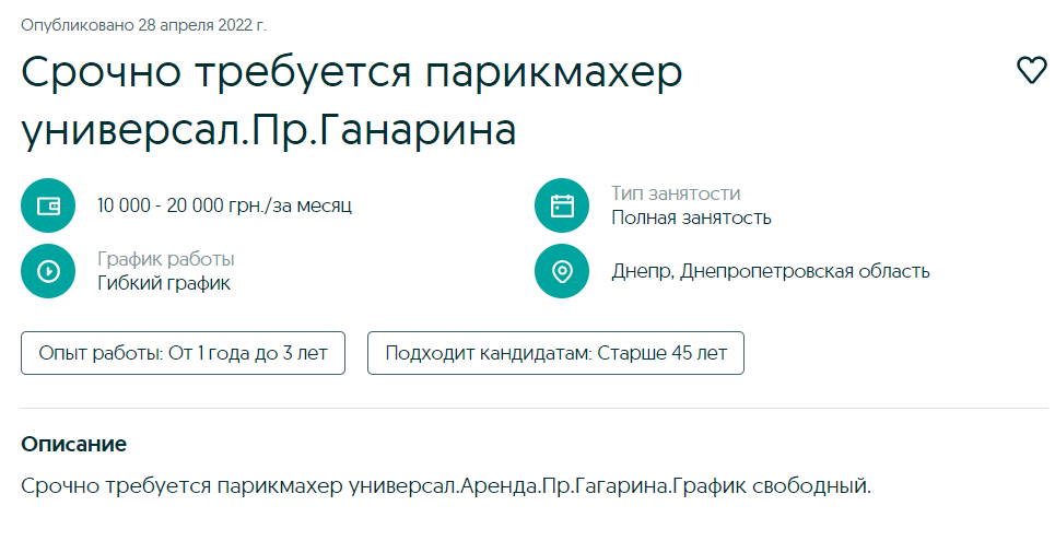 Парикмахер-универсал, устроившись в салон сможет зарабатывать от 10 до 20 тыс грн в месяц при полной занятости и гибком графике работы. Подробности срочной вакансии в Днепре предлагают выяснить на месте.
