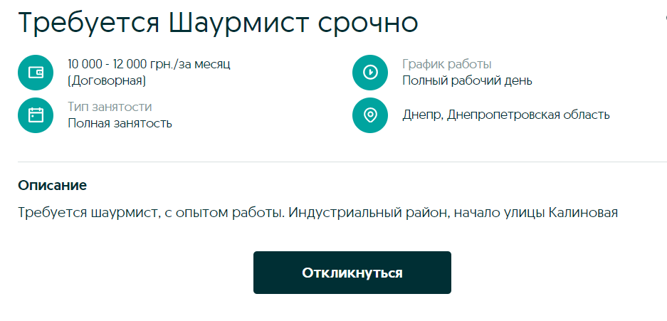 Для приготовления быстрой уличной еды в Днепре срочно ищут шаурмиста. Платить будут от 10 до 12 тыс грн, график работы - полный день. Желательно иметь опыт работы и вкусно готовить шаурму.