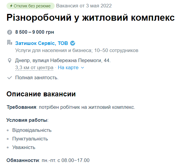 Разнорабочий в ЖК может претендовать на зарплату 8,5-9 тыс грн. Среди требований – ответственность, пунктуальность и внимательность.