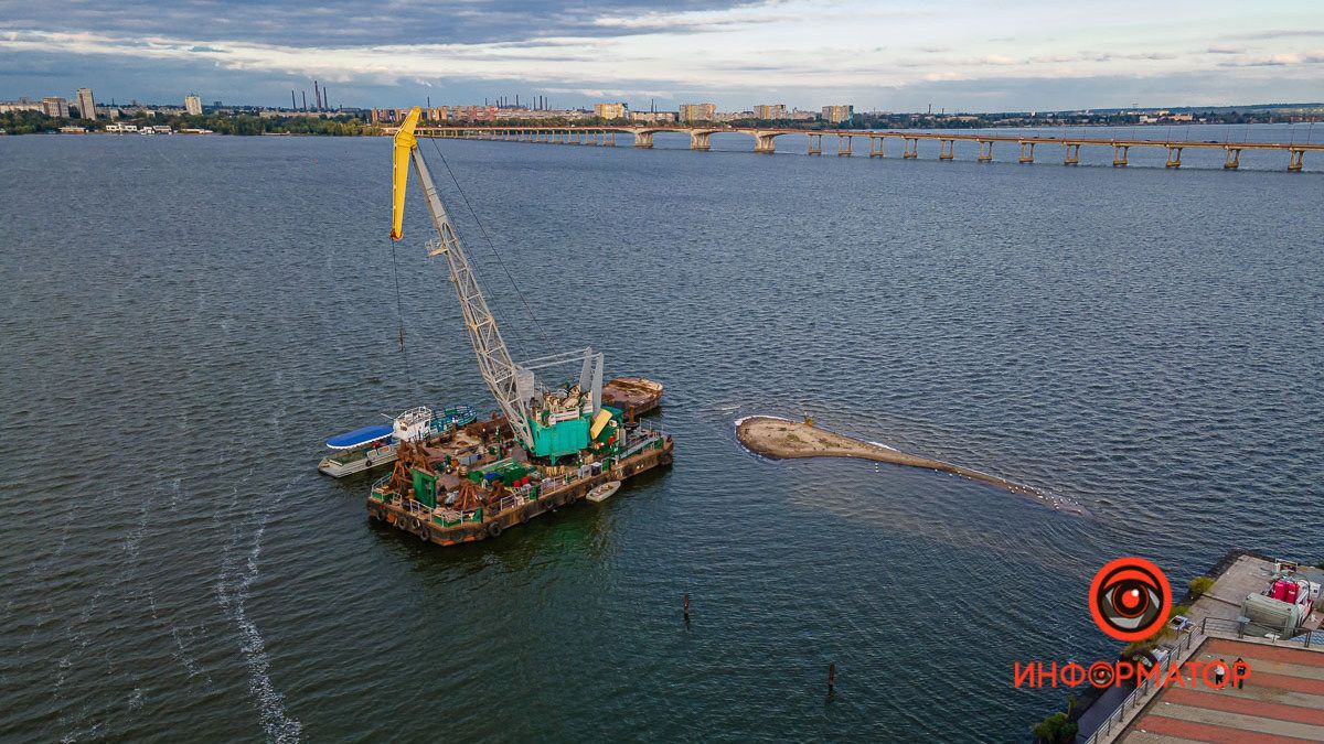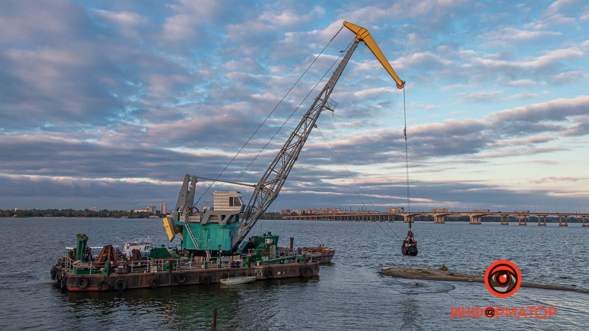 Теперь возле острова работает баржа с краном, который начал свою работу. Вскоре «лишний» остров исчезнет с реки Днепр.
