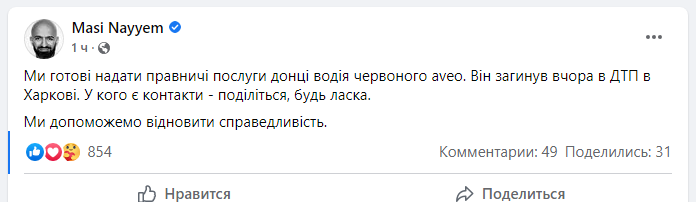 Анастасия Носова, чей отец погиб вчера ночью в харьковском ДТП, записала эмоциональное видео, где просит помочь найти хорошего адвоката и свидетелей аварии. По ее словам, они сегодня собирались всей семьей отмечать радостную дату, а вместо этого вынуждены опознавать отца в морге.