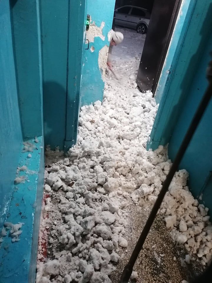 Ликвидировать последствия стихии людям пришлось собственноручно. Снежную кашу жильцы выгребали швабрами через подъезд на улицу.