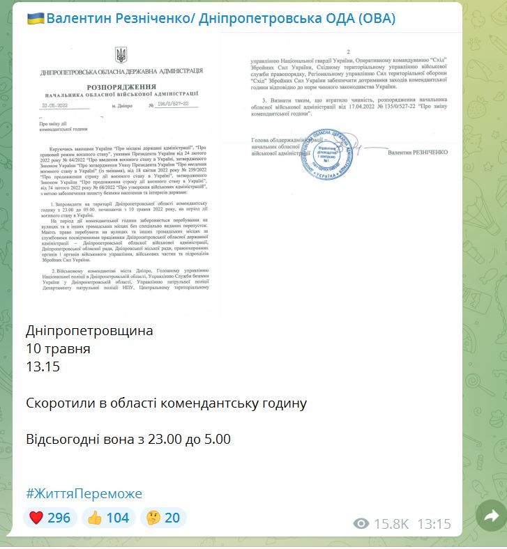 Теперь комендантский час на Днепропетровщине будет начинаться на час позже - в 23:00. И заканчиваться в 5:00. Действует это нововведение с 10 мая. Напомним, комендантский час вводится на все время действия военного положения в стране.