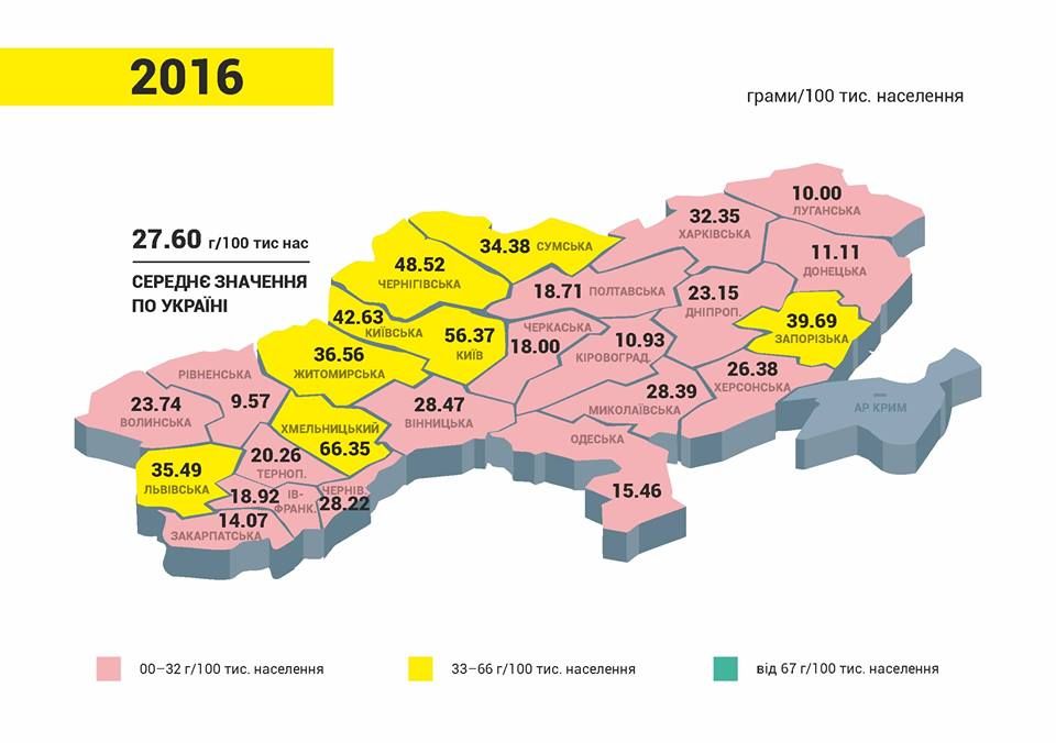 В течение следующего 2016 среднеукраинское значение использования морфина уменьшилось почти вдвое, а лидером стал Харьков. Использование в Днепропетровской также уменьшилось и в общеукраинском рейтинге регион занял 15 место.