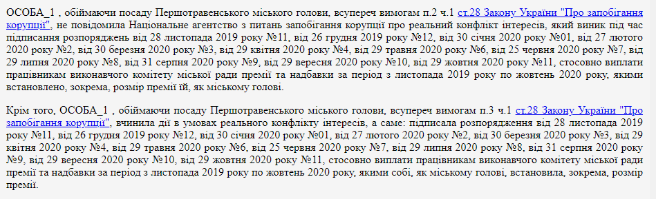 В постановлении суда также говорится о том, что мэр Оксана Винницкая действовала вопреки Закона Украины "О предотвращении коррупции" не сообщила о конфликте интересов, который возник во время ее пребывания на должности. Сама же чинновница не считает себя виновной, и уверена что действовала в рамках своих полномочий.
